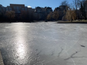 Beaconの街なみを見ながら歩いていくと、2日目朝に立ち寄ったBoston Public Gardenに到着。真冬の公園内の池は、すっかり凍っていました。さすがお国柄というか、アイススケート(ホッケー)の練習をしている人もいて、その寒さを目で実感しました笑