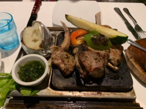 メインにはラム肉を選びましたが、Grilled and Served on the Stoneのメニューからはエビなどの海鮮系も選べます。我々はさんざんシーフードを食べてきたので、ここではラム肉にしました。それほど臭みもなく、熱々の鉄板に乗せられた肉は香ばしい香りを漂わせながら運ばれてくると食欲をそそります。そのままでも美味しかったですが、チミチュリソースと合わせて食べると尚良しです。